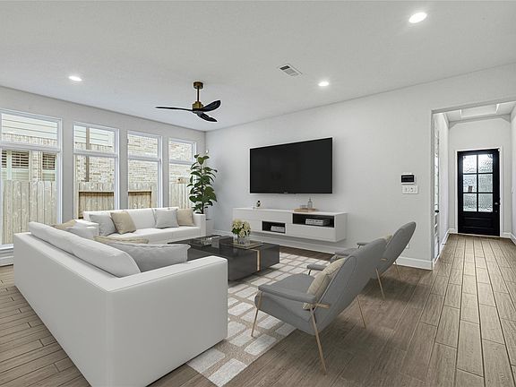 Welcome to your like-new home in the sought-after Grand Central Park community! This luxurious 3-bedroom, 2-bathroom residence is filled with designer-inspired finishes and thoughtful updates throughout. Gorgeous wood-look ceramic tile flooring, upgraded light fixtures, and ceiling fans enhance every room. The chef’s kitchen features an oversized island with custom paint, gold hardware, and modern lighting, all overlooking the open living room—perfect for entertaining. Inviting breakfast and dining area with large windows, seamlessly connected to the kitchen. A flexible office or den offers endless options for work or relaxation. Spacious primary suite with plush carpet, stylish gold finishes, and a spa-like feel. Outside, enjoy the tranquil extended patio, beautifully updated landscaping, and the privacy of no rear neighbors. As part of this master-planned community, you’ll enjoy amazing amenities including a resort-style pool, dog park, The Lake House recreation complex, and more!