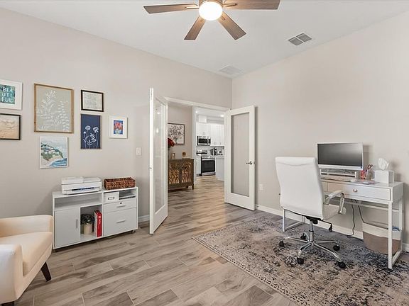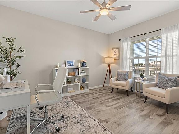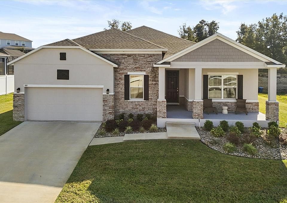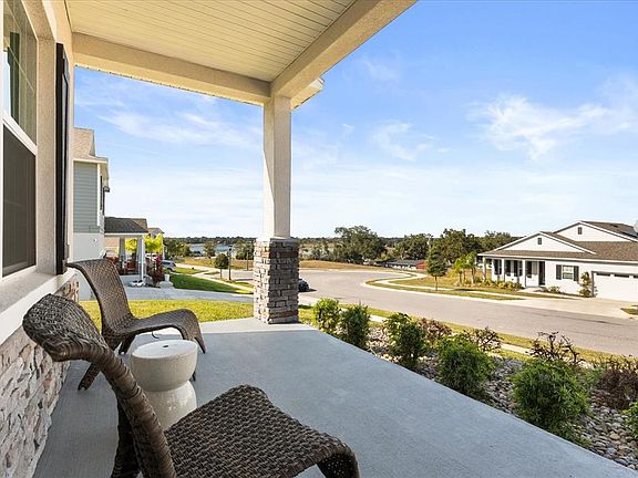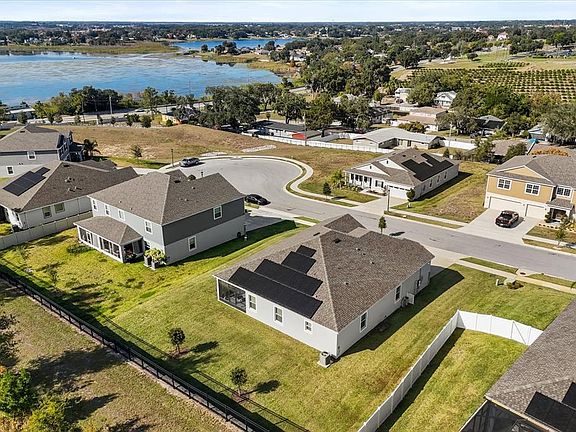 Energy-efficient living meets small-town charm in the heart of Polk County! This beautiful 3-bedroom, 2-bathroom home is tucked away on a quiet interior lot at the end of a cul-de-sac, offering extra privacy and a peaceful setting with no through traffic. Enjoy stunning lake views and fabulous sunsets from the welcoming front porch—your new favorite spot to unwind. Step inside to an open living floor plan filled with abundant natural light, complemented by neutral paint and designer lighting throughout. The well-appointed island kitchen offers great workspace for cooking and entertaining. Wood-look ceramic tile flows through the main living areas for style and easy maintenance. A spacious front office provides the perfect dedicated workspace. Retreat to the serene primary bedroom featuring an ensuite bath and walk-in closet. Two additional bedrooms and a full bath offer comfort for family or guests. Thoughtfully designed for efficiency, this home includes solar panels, a water softener, and a Tesla backup battery that powers half the home during outages. The 3-car tandem garage offers generous storage space. Enjoy peaceful backyard views from the screened-in patio, with plenty of green space for pets and play. Located in an established neighborhood with mature trees, this home offers the true small-town feel while still providing quick access to HWY 27, local shops, dining, parks, beaches, and nearby cities. A perfect blend of comfort, efficiency, and convenience!