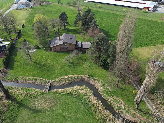 A rare masterpiece of hand-built craftsmanship, this Swiss-style home sits on 5 private acres w/ stunning mountain views. Built w/ old-world European detail, it features handcrafted cedar, vaulted ceilings, & a striking two-story brick fireplace. The great room flows into open living & dining areas, w/ a charming second-floor balcony above. A covered deck overlooks a serene creek that runs through the property. The main home includes a reading room, office, spacious dining area, & a luxurious ensuite with soaker tub. A basement workshop adds space for hobbies or storage. Radiant hot water heat & hardwood floors create a warm, natural interior. A second residence offers rental income — please do not disturb tenants. This is a rare opportunity to own a truly distinctive, high-quality home.