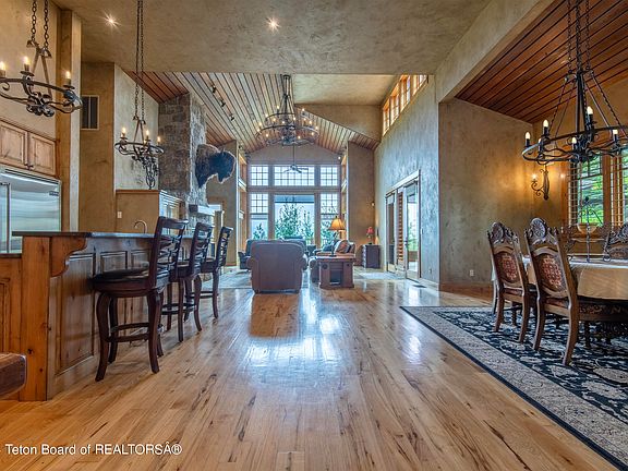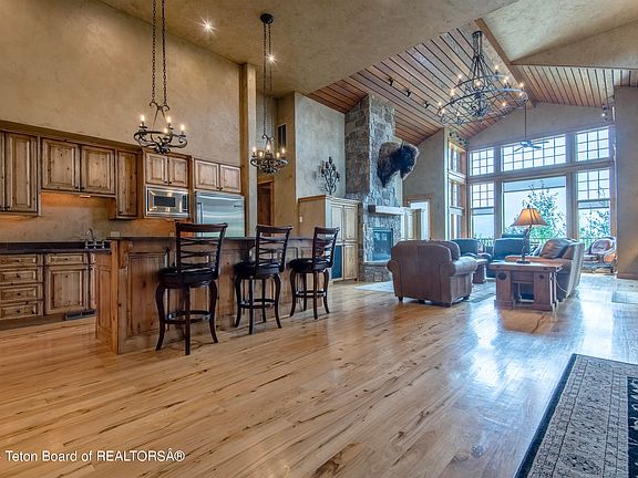 Perched above the Teton River featuring full Teton range views, sits this truly exceptional River Rim Ranch residence. High end finishes throughout, including hickory floors, stone fireplace & massive east-facing windows framing that perfect Teton view. The gourmet kitchen is a chef's dream with Viking appliances & stone slab countertops. The main floor primary bedroom is a relaxing sanctuary with private fireplace & ensuite bathroom. Two more bedrooms, each with private ensuites are tucked away upstairs. Enjoy expansive Teton Valley views from the large deck. River Rim Ranch is gated with direct access to the Teton River & owner access to River Rim Lodge facilities. Enjoy 4 seasons recreation from this phenomenal home that makes a perfect retreat with short term rentals also allowed.