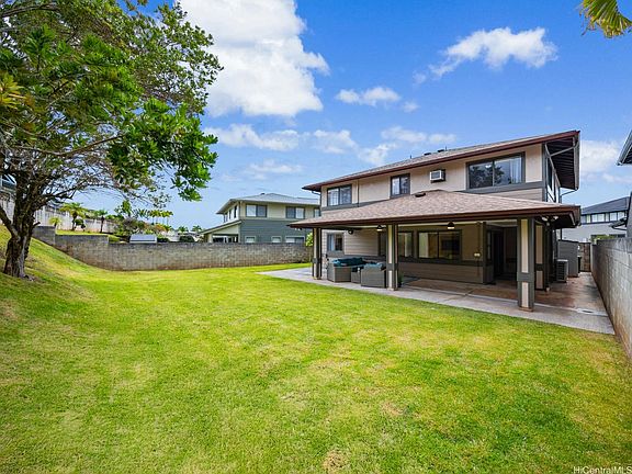 Welcome to the Island Classics of Kapanoe! Tucked in a QUIET CUL-DE-SAC, this 3-BED, 2-BATH HOME has been lovingly maintained by the ORIGINAL OWNERS and impresses with SOARING TWO-STORY CEILINGS in the entry, living, and dining areas filled with NATURAL LIGHT. In addition to the MAIN LIVING ROOM, the home features TWO MORE LIVING SPACES—one off the kitchen, perfect for entertaining, and another upstairs that can serve as an office, lounge, or creative retreat. Major updates include a NEW ROOF, FRESH PAINT, NEW CARPET, LAMINATE FLOORING, CORIAN COUNTERS in the kitchen & baths, and UPGRADED STAINLESS STEEL APPLIANCES, making the home MODERN AND MOVE-IN READY. A COVERED PATIO and GENEROUS YARD extend the living space outdoors, ideal for entertaining. Located in the MILILANI IKE ELEMENTARY SCHOOL DISTRICT, a NATIONAL BLUE RIBBON SCHOOL. Nearby REC 7 offers a HEATED POOL, KIDDIE POOL, BBQ PAVILIONS, PLAYGROUND, INDOOR COURTS, GATHERING AREAS, and STARBUCKS. Residents enjoy 7 REC CENTERS with LAP POOLS, WATERPARKS, FITNESS FACILITIES, and events such as CRAFT FAIRS, CHEF SHOWCASES, & BINGO NIGHTS to name a few.
