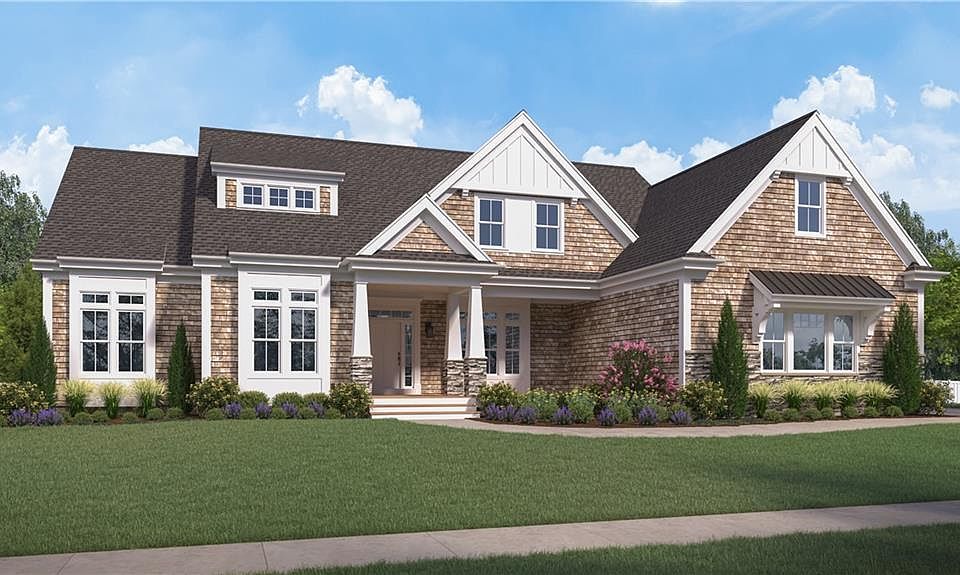 TO BE BUILT – The Weston is a 2,530 sq. ft. custom single-level home in the desirable North Woods community of South Kingstown. Designed by Meridian Custom Homes, this residence offers 4 bedrooms, 2.5 baths, and a 2-car garage. The exterior highlights natural cedar shingle siding, stone accents, and a welcoming front porch with columns. Inside, an open floor plan with 9’ ceilings and transom windows fills the home with natural light. The great room features a cathedral ceiling, wood-burning fireplace, and custom built-ins. The kitchen includes 42” cabinetry with glass doors, granite countertops, tiled backsplash, oversized island, walk-in pantry, breakfast area, and formal dining with custom wall detailing. The primary suite offers a reading alcove, walk-in closet, and spa bath with double sinks, soaking tub, and tiled shower. Three additional bedrooms and a family bath complete the private spaces. Additional features include hardwoods in main living areas, tile baths, laundry/mudroom, Navien on-demand hot water, and gas-fired warm air with central AC. Outdoor living is enhanced by a rear deck. ***Offered at $1,544,500, The Weston blends coastal New England charm with single-level convenience in a thoughtfully designed layout for today's lifestyle.*** Choose from a variety of options and finishes when working with Meridian Custom Homes. Photos are of previously built homes and may depict options not included herein.
