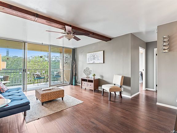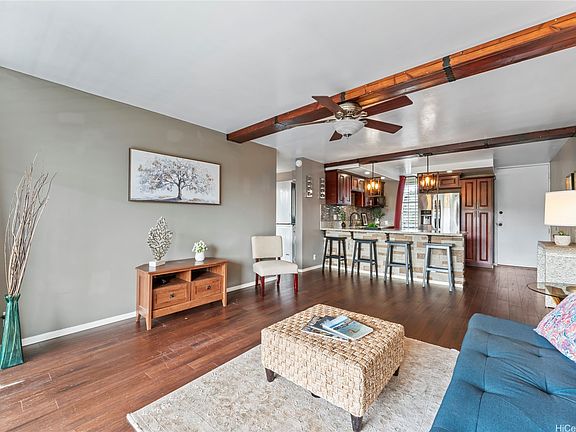 Treetop breezes and gorgeous valley views from this uniquely renovated 2 bedroom, 1 bathroom, 2 parking (one covered), condo with in-unit laundry (in the hallway, NOT in the kitchen)& external storage area. Kitchen features upgraded cabinets and appliances, stone countertops and backsplash, pendant lights and breakfast bar overlooking living room. Living room features wood beam ceiling, with ceiling fan and access to the lanai with gorgeous, breezy views (You can even see the swimming pool!). Storage area approximately 6' x 6' and located on the 9th floor. Two assigned parking spaces, one covered on the second floor and one uncovered on the third floor. You DON'T have to walk up any stairs to get to the unit from the parking stalls. There are walking bridges to the building from both stalls.