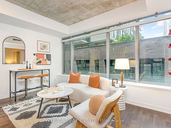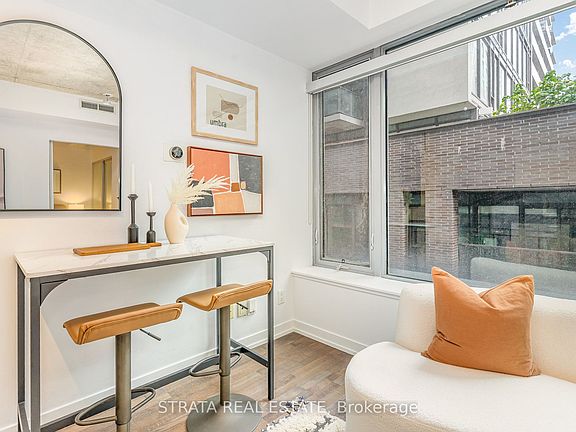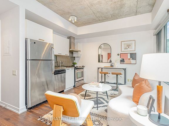 Experience modern urban living in this stylish junior 1-bedroom suite at the highly sought-after Fuse Condos by Freed Developments. This thoughtfully designed space features a separate bedroom with frosted sliding glass doors and two closets, offering both functionality and privacy. The open-concept layout boasts hardwood floors throughout, exposed concrete ceilings, and a wall-to-wall window that fills the home with natural light. The kitchen is equipped with stainless steel appliances, stone countertops, and ample storage, while the convenience of ensuite laundry makes daily living a breeze. Located in the vibrant Central King West neighbourhood, you're steps to King & Bathurst Streetcars, bars, restaurants, coffee shops, boutique shops, Loblaws, and nightlife, providing easy access to everything the city has to offer. Whether you're a first-time buyer or investor, this unit is the perfect blend of style, location, and convenience.