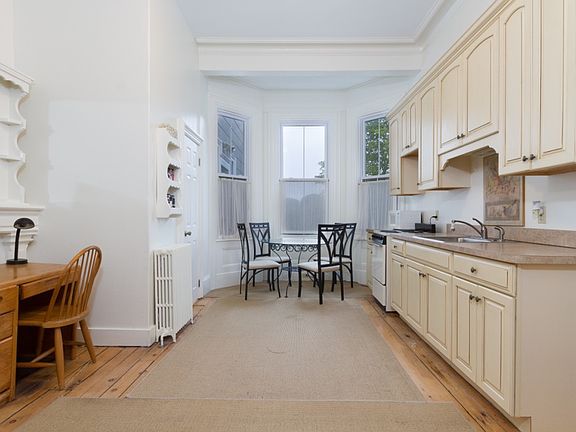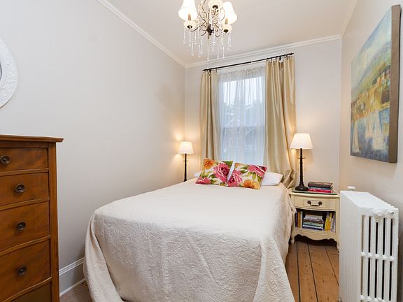 Sunny & inviting first-floor one-bedroom apartment at historic Almy Manor blends Victorian character with modern comfort. Featuring soaring 12-foot ceilings, hardwood floors, and plenty of natural light, the space comes fully furnished with a queen-size bed, pull-out couch, and an inviting eat-in kitchenette.