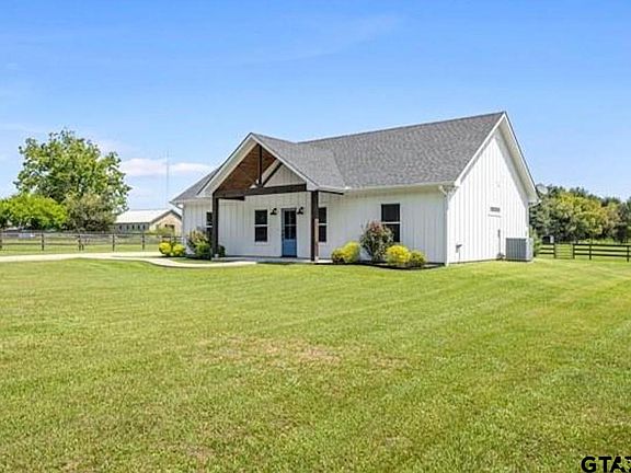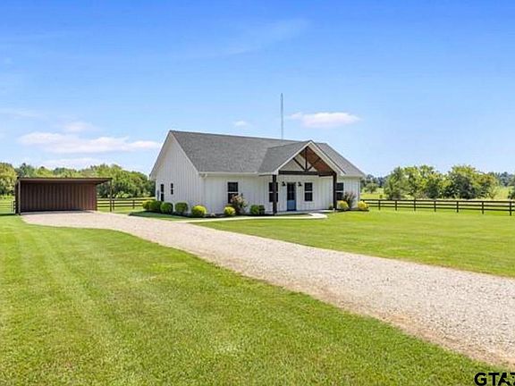 Attractive 3 bedroom, 2 bath home comes with landscaping, Smart Siding, 2-car carport, and a spacious 4 acres! Located on a quiet County Road southeast of Sulphur Springs, enjoy the panaromic views from the vaulted porches. Step inside an impressive entrance with wood-ceilings and vaulted open floor plan. A vent-less gas log fireplace will provide lots of cozy ambience on cold, brisk nights. Bring your recipes to a kitchen with marble countertops, 2 ovens, island with breakfast bar seating, farmhouse sink, tile backsplash, stainless steel appliances, and door to covered back porch. Durable porcelain wood-looking floors presents a beautiful flow throughout the living, dining, laundry room, and bathrooms. The primary bedroom comes with a vaulted ceiling, walk-in closet, double sinks, and a walk-in shower with subway tile. Split from the primary bedroom, the guest bedrooms share a full bathroom with subway tile in the shower. A laundry room and mudroom are located near the back entrance. Additional perks include recessed lights, spray-foam insulation in attic, marble countertops in the bathrooms, ceiling fans, carport storage area, outdoor fire pit, gutters, and French drains. Work from home with HIGH-SPEED INTERNET while relishing this spectacular country setting, only minutes to town!