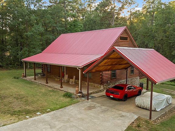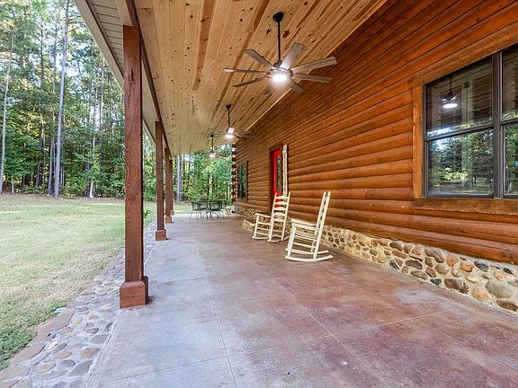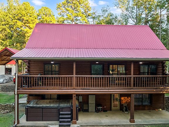 Beautiful 3-Level Log Cabin featuring 5 Bedrooms with 3 full Baths. This spacious 3,675 sq ft log cabin offers 3 levels of comfortable living on 6.28 private acres, located just off Highway 59 with convenient access to shopping and dining. The home features 5 bedrooms and 3 full bathrooms—one on each level. The main En-suite bedroom is separated from the other bedrooms for added privacy. The mid-level entry opens into an open-concept kitchen, dining, and living area with tall ceilings, custom blinds, and floor-to-ceiling windows that bring in natural light and scenic views. The kitchen includes painted cabinets, a gas stove/oven, dishwasher, island, pantry, and a new refrigerator. Washer and dryer are also included. A propane gas log fireplace adds warmth to the living area. Step outside to a newly stained back deck featuring new wood ceilings and ceiling fans—perfect for relaxing outdoors. The lower level includes a second living area, kitchen space, two bedrooms, and a full bath. Walk out to a patio with a heated swim/spa that can be enjoyed year-round. Additional features include: newer metal roof (installed March 2023), paved two-car carport with matching metal roof, and a newly roofed and sided outbuilding—ideal for storage or a workshop. This well-maintained home offers space, privacy, and a versatile layout in a peaceful setting while still being close to town.