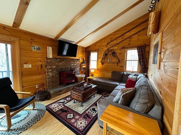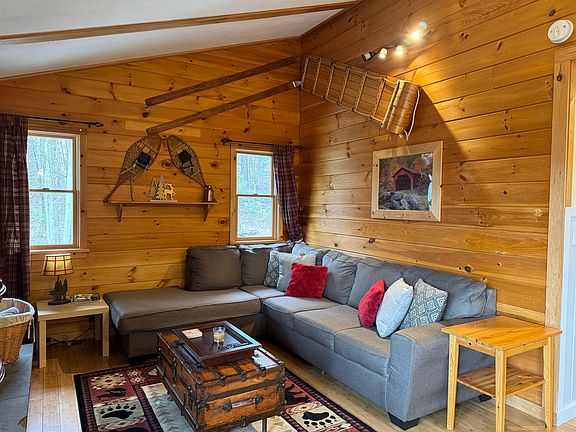 Conveniently located 4 bedroom, 2 bath chalet situated on a private wooded lot, minutes to Mt. Snow, the Hermitage Club and the Vast snowmobile trails. This wonderfully renovated home is tastefully finished with pine walls and wood floors creating a warm cabin feel. Renovated kitchen offers granite counter tops, center island with cook top, breakfast bar, and stainless appliances. Open concept living, dining and kitchen is ideal for gatherings with family and friends.  Additional features include; living and dining with vaulted ceiling, wood floors, a beautiful master bath, with heated travertine floors, granite countertop, and tumbled stone subway tile, a game room with wood burning stove and a large mudroom entry with heated floors to warm your feet, along with plenty of storage for all your winter gear. After a long day of fun on the slopes or sledding, relax in the 6 person private outdoor hot tub on a covered gazebo. New roof 2023 and along with expansive driveway improvements. Being sold furnished. This truly is a turnkey property awaiting new homeowners!