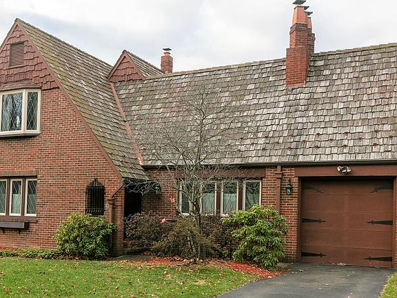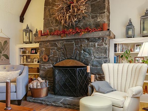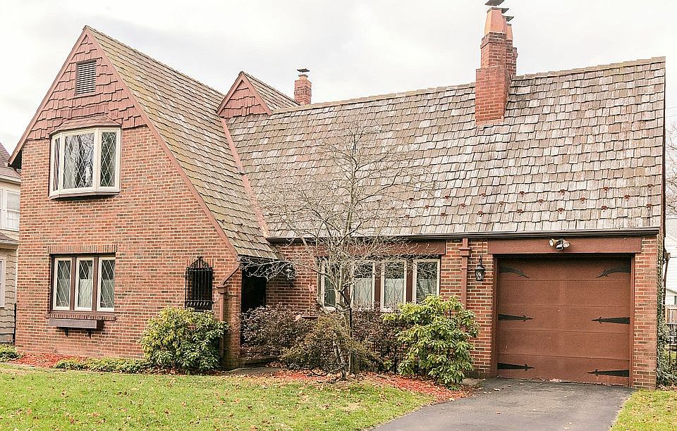 Beautifully kept English cottage style Tudor w/storybook character throughout. Living room w/floor to ceiling stone fireplace & beamed cathedral ceiling. Large Kitchen w/breakfast nook, dining room, & 3-season room. 1st floor bedrm w/half bath currently used as a cozy-den can function as an office or craft rm. 2nd floor has 2 spacious bedrooms w/nice closets, full bath & sizeable attic. Curved archways; gorgeous woodwork, hardwoods, & doors; beautiful built-ins; & over $20,000 in Diamond Lead windows add to the unique charm. Fenced yard, attached garage, & all on a pretty tree-lined street.