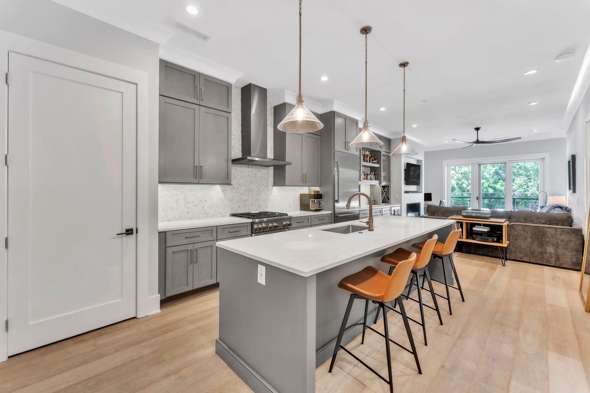 Private balconyEco-friendly bioethanol fireplaceSpa-like finishesStylish half bathBig island with seatingRich hardwood floorsMarble herringbone backsplash