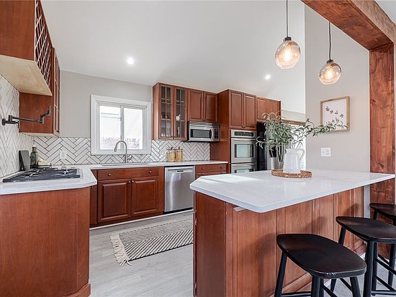 - Breakfast Bar, Cathedral Ceiling(s), Entrance Foyer, Eat-in Kitchen, Separate/Formal Living Room, Kitchen Island, Living/Dining Room, Other, Quartz Counters, See Remarks, Sliding Glass Door(s), Natural Woodwork, Bedroom on Main Level, Programmable Thermostat