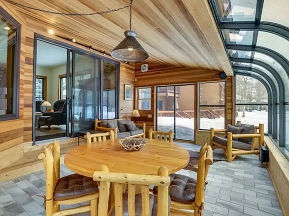 Head up to the first floor where you'll find an open-concept kitchen and living room, fully equipped with granite countertops, stainless steel appliances, and a traditional gas fireplace to create a warm and welcoming ambiance. Take in the fresh mountain air on the back patio, which features a BBQ grill and ample seating for lounging and socializing. Adjacent to the living room, you'll find a sunroom filled with tables and couches, perfect for enjoying the afternoon sun, playing games or enjoying a meal together. The first floor also has a full bathroom for added convenience.