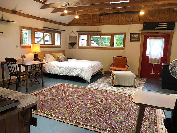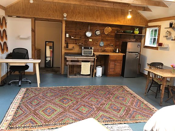 Fully Furnished, Light flooded Barn Studio ideal for writers, visiting professors and artists or anyone seeking a quiet and cozy respite. Sky lights, exposed beams, and a Pellet Wood Stove. This is a simple no frills but tastefully and rustically decorated retreat. The barn is privately set back, perched on a small hill behind the main house where I live. You have your own private entrance and bathroom. It's an 8min drive from Florence and a 13 min drive to Smith College in Northampton. It's a 10 min drive to The Co-op and a 20 min drive to Umass & Amherst Colleges. The property sits on 5 acres on the Haydenville/West Whately border. Lovely gardens, fruit trees, and hiking trails up behind the house. The kitchen is a simple "bachelor style" kitchen with a Convection Oven, Refrigerator, tea kettle, and a double burner electric stove.