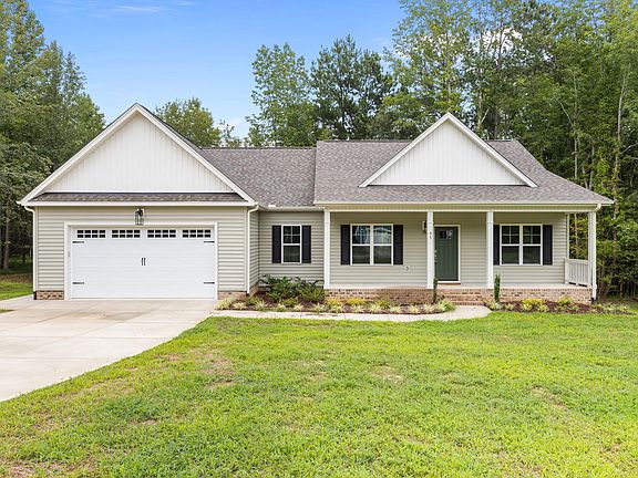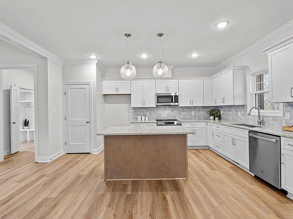 AMAZING LENDER CONCESSIONS AVAILABLE! USDA FINANCING ELIGIBLE! CUSTOM-BUILT RANCH PLAN featuring luxury hardwood-style flooring throughout main living areas. The kitchen showcases granite countertops, custom painted cabinets, a center island with pendant lighting, and stainless steel appliances including a smooth-top range, built-in microwave, and dishwasher. The owner's suite offers hardwood flooring, a ceiling fan, and a walk-in closet with direct access to the laundry room. The spa-like owner's bath includes a dual vanity and a spacious walk-in shower. The open family room boasts a vaulted ceiling, gas log fireplace with mantle, and ceiling fan with light. Additional features include a home office with built-in shelving and desk area, plus a covered rear porch overlooking the wooded backyard.
