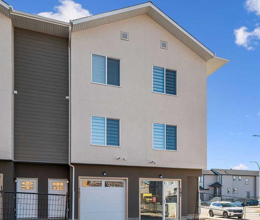 LOW CONDO FEES | MOVE-IN READY | 5 BEDROOM END UNIT | MAIN-FLOOR PRIVATE GUEST SUITE | TOTAL 1,950 SQ FT | Welcome to Unit 101 at Saddlecrest Living, a rare 5-bedroom, 4-full bath end unit in a brand-new 43-townhome community bringing a fresh take on suburban living in Calgary’s Northeast. This home is designed across three levels with an attached garage, offering both space and flexibility for families. A highlight is the main-floor guest suite with a full bath and private rear entry, perfect for parents, older kids, extended family, or for guests, and it also offers potential for future rental income. The main floor features an open layout with 9-foot ceilings and triple-pane windows, filling the home with natural light while improving energy efficiency. The kitchen includes floor-to-ceiling cabinets, premium quartz countertops, and stainless steel appliances, creating a modern and high-end finish. Upstairs, the primary bedroom offers a custom shower with a built-in seat, and every bathroom is finished with full-height tile for a clean, modern look. Carpeted bedrooms add comfort, while luxury vinyl plank flooring on the main level provides durability and easy maintenance. Built for Calgary’s weather, the exterior combines stucco and Hardie siding for hail protection and low maintenance. At Saddlecrest Living, you are part of a connected community close to schools, playgrounds, Saddletowne LRT, shopping, clinics, and fitness centres, with quick access to Stoney Trail, the airport, Costco, CrossIron Mills, and New Horizon Mall. MOVE IN WITH EASE - CONDO FEES ARE WAIVED FOR THE FIRST YEAR so you can settle into Saddlecrest Living without added costs. Whether this is your first home, your next step as a growing family, or a smart investment, Unit 101 delivers space, versatility, and community in one of Calgary’s most dynamic corridors. Come experience this beautifully finished showhome in person. Units in this building are available for purchase individually or as a full package.