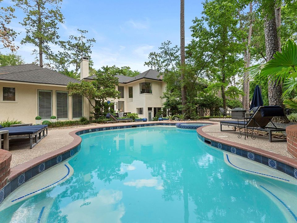 I am thrilled to announce the availability of this stunning custom home on the market. It's time to make that move. This property boasts custom front doors from Argentina, soaring ceilings, a split floor plan, an open kitchen and living area, and an abundance of natural light throughout. The kitchen features all stainless appliances, including a double oven, gas cooktop, and new stainless Subzero refrigerator. House sited on heavily wooded lot which preserves the authenticity of The Woodlands and its pine trees. Two patios provide ample space for entertaining, including a covered patio upstairs off the kitchen and an open patio adjacent to the pool and hot tub. This lovely four-bedroom, five-bath home is located in one of the most desirable areas of The Woodlands, just minutes or a bike ride away from Market Street, Hughes Landing, and The Waterway. The community offers great schools, fine dining, shopping, and is just minutes away from the famous Cynthia Woods Mitchell Pavilion.