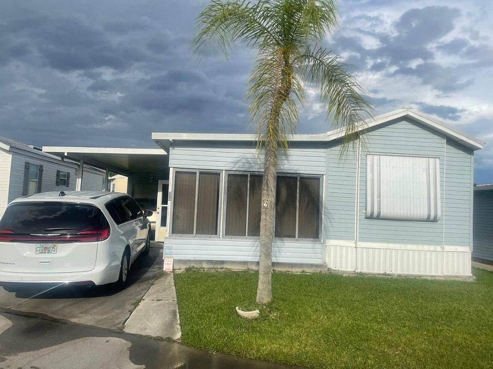 New renovation in 2025 on a double lot in KOA resort sits a 1994 MERI mobile home with new AC extended into the Florida room, The lot has a carport