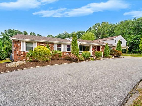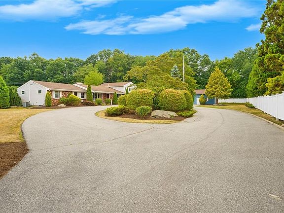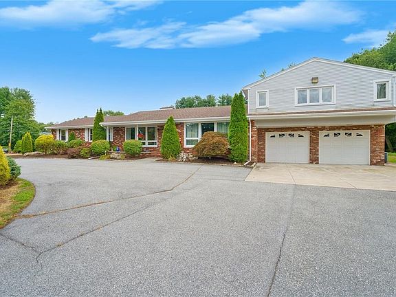Sprawling, one owner ranch style home situated on over an acre directly across from Knight's Farm Neighborhood on the Cranston line. With well over 3,000 ft of living space, and an additional 1,144 ft detached 3 bay garage (with heat + electric), this property has exactly what you need. An oversized family room with marble flooring leads into an impressive, 32x17 sunroom adorned with custom stained glass windows. Perfect for hosting nightly family dinners, or entertaining a crowd, the updated kitchen with granite, hardwoods, and stainless steel appliances has the size and layout to accommodate all gatherings. The hardwoods continue through to the 1st floor primary bedroom (with bath), and 2nd bedroom. There is a well-sized full bath by the bedrooms as well. A show-stopping stone fireplace highlights the living room/dining room right off the open style kitchen. A staircase off the family room takes you up to the 2nd story private quarters above the integral 2 car garage. There you will find 1-2 bedrooms w/ closets, full bath, and common room. Central air is present to keep you cool, and updated plumbing, hot water, and forced water heating will keep you toasty. A whole-house Generac generator is connected for peace of mind. The basement features a brick fireplace, bulkhead and 1,800+ ft which could be finished. Vinyl + brick exterior, 200 amp electric, updated 4 bed septic, sprinklers, many newer windows, the amenities keep going. Special property.