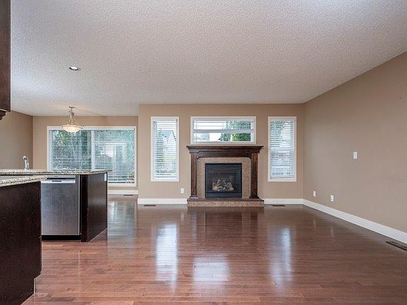 The living room is large and spacious and features a gas fireplace. The kitchen comes equipped with upgraded appliances and modern finishings. Dining area is connected, and the main floor features hardwood flooring.