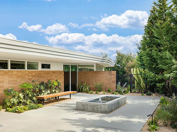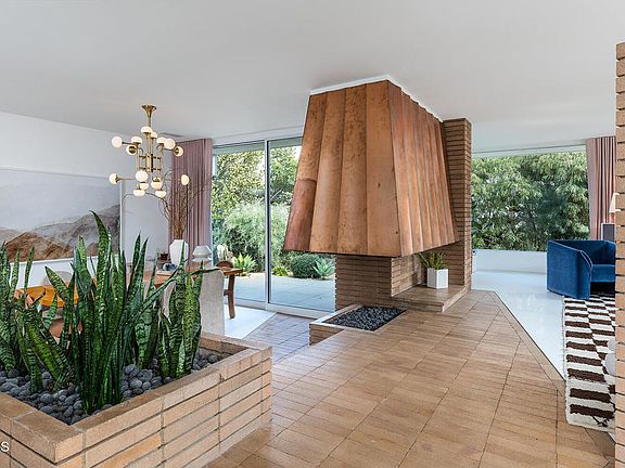 Design wins, simplicity stands out and here, nature is the ultimate inspiration. Designed to maximize the quintessential Southern California lifestyle and sited to benefit from natural light, sweeping vistas and garden views, this mid-century modern home is quiet luxury defined. From the stacked brick facade curving into the entry and living room, to the aggregate bench hearth in the family room amplifying the artistry of terrazzo floors, elegance and welcome are the mantra. Brass inlays score the terrazzo creating symmetry and warmth that crescendos at the copper fireplace hood separating living and dining rooms. An array of carefully curated brass lighting fixtures echo this warm welcoming feeling, carrying it to every room. Designed by Albert Frey disciple Harold B. Zook, meticulously renovated in conjunction with noteworthy Angelenos architect Emily Farnham, interior designer Sarah Sherman Samuel and landscape architects Terremoto, from curb to fence and far beyond the eye is engaged. The kitchen is a refined showpiece where hues of green and grey mingle, pulling leafy landscapes indoors through walls of windows blurring boundaries between indoor and outdoor space. Practical features include large walk-in pantry, high end appliances and dramatic marble island with double-waterfall seating for four, and adjacent large laundry room. A breakfast room, with walls of glass, looks toward Annandale Canyon. Although totally open to a large outdoor patio and canyon garden view, the space feels protected and private; perfect for sleepy morning conversation over coffee or tea. A showcase vestibule separates the primary suite from public and family spaces, with picture windows serving as art walls offering sun drenched built-in sofa seating below blue skylight views. The primary suite turns up the design volume with absolute integration of indoor and outdoor space and artfully simple interior choices with built in headboard, night stand stands and pendant lighting, it is a true retreat. Heated floors and huge walk-in closet are fun and a beautiful spa-like bathroom boasts a splendid canyon view from the soaking tub. The property opens and blossoms here where views of pool, patios, gardens, canyons and mountains conspire to create an ever changing one-of-a-kind experience. Brilliant architecture, design collaboration over generations, and the perfect Pasadena hilltop perch above the Arroyo Seco intersect to create this unicorn experience. There is only one.