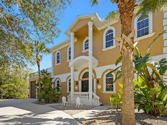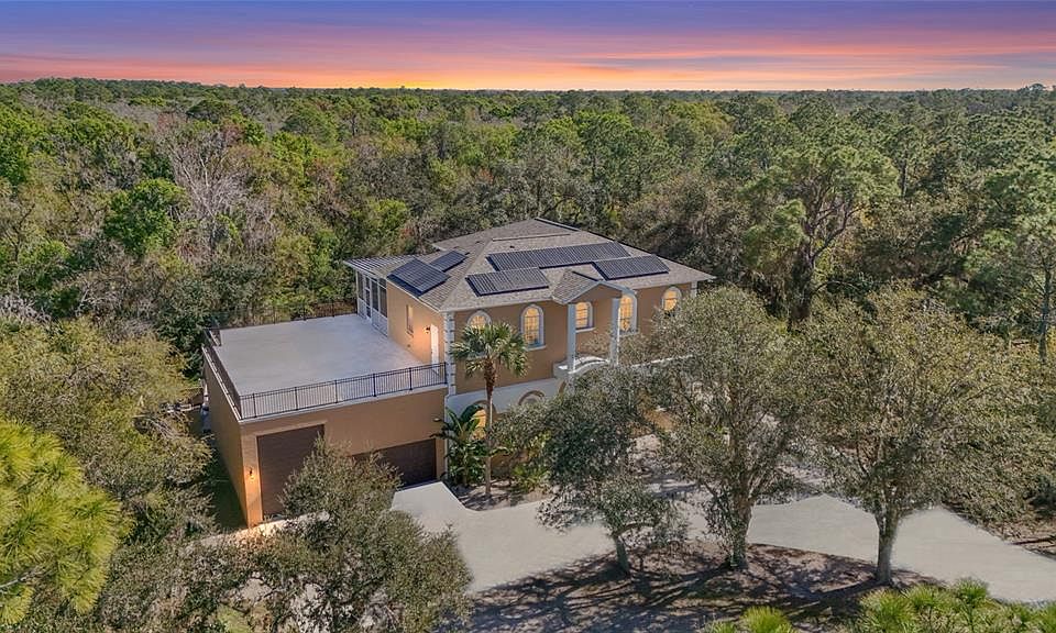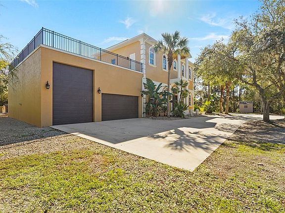 Welcome to an exceptional, one-of-a-kind luxury estate offering total privacy, massive upgrades, and unmatched versatility, all just minutes from Lakewood Ranch and every modern convenience. At the heart of this property is a jaw-dropping RV and collector’s dream garage! The Garage is hurricane-rated, plumbed for a future bathroom, equipped with two 50-amp hookups, soaring ceilings, and space to accommodate a 45+ foot RV plus up to six vehicles, boats, toys, or showroom-quality car storage. Truly unmatched. This solid concrete, all-block construction estate features soaring 15-foot ceilings on both levels, elegant crown molding throughout the great room, dining area, and kitchen, and an incredible coral stone gas fireplace that anchors the living space with dramatic beauty. The thoughtfully designed floor plan offers 4+ bedrooms and 4.5 bathrooms, including a private-entry in-law suite or office — perfect for multi-generational living, guests, or Airbnb potential. The lower level features a versatile game room or potential second owner suite with wet bar, mini fridge, oversized storage, dual-sink bath, large shower, and hurricane-rated doors opening to the pool oasis. An acoustically soundproof theater room delivers a true cinematic experience and can easily serve as an additional bedroom or retreat. Upstairs, the primary suite boasts a spa-style bath with jacuzzi tub and dual sinks, plus access to a stunning 1,500-square-foot upper deck overlooking the heated massive elevated custom pool including zero-entry tanning shelf, eight-person spa and surrounded by travertine is an entertainer’s paradise offering breathtaking views. All of this sits on over 8 private acres with a long, secluded driveway offering TOTAL PRIVACY with NO HOA, NO water bill, NO flood insurance requirement, low insurance, and because of the solar panels, a very low electric bill! This is a true luxury compound, entertainer’s oasis, multi-generational estate, and investor opportunity wrapped into one — powered by green energy, built to last with solid concrete construction, and unlike anything else on the market. Nothing compares in Sarasota or Lakewood Ranch for acreage, privacy, construction quality, and proximity to town — with Publix, Aldi, Starbucks, hospitals, top-rated schools (including Out-of-Door Academy), restaurants, parks, salons, theaters, and country clubs just minutes away. Priced well below appraisal. Exceptional. Private. Luxurious. One-of-a-kind.
