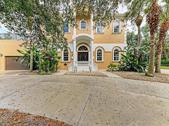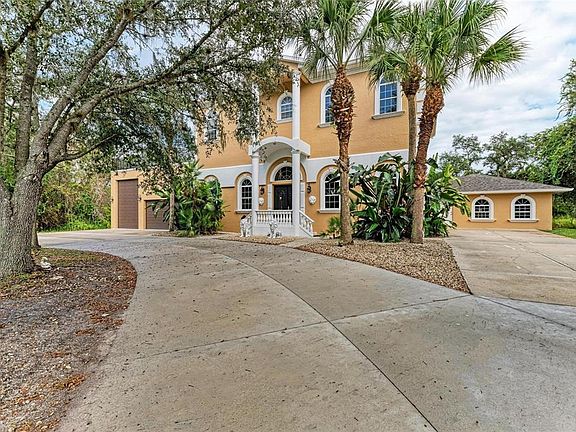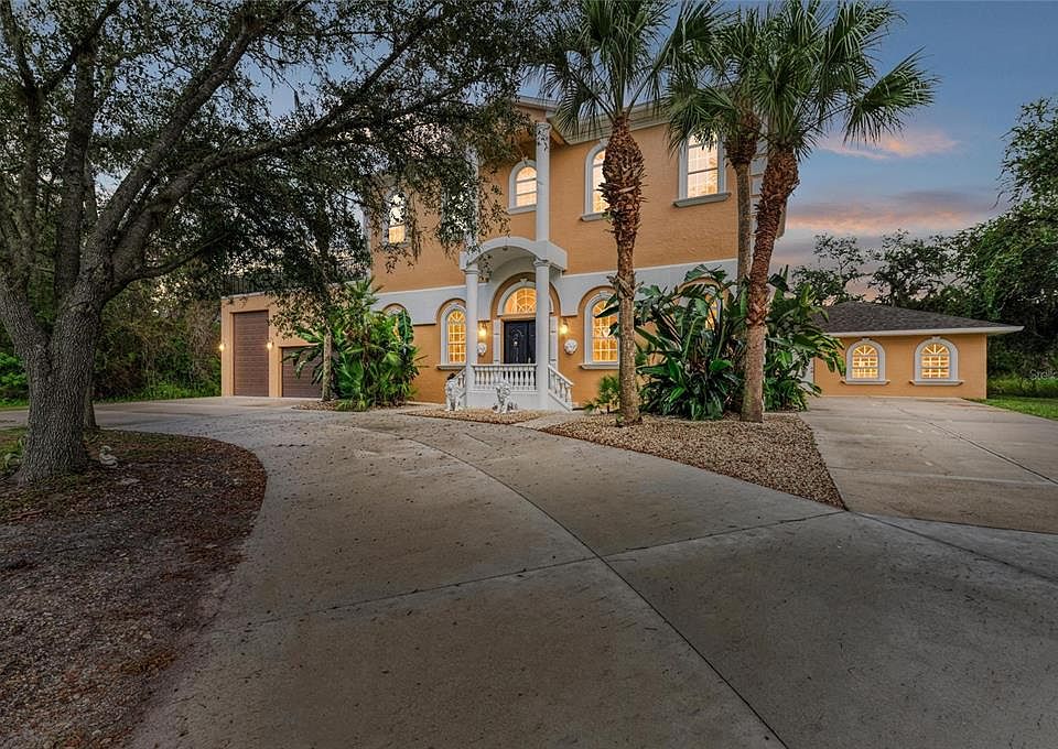 NO DEED RESTRICTIONS | SOLAR | NEW ROOF| TRAVERTINE HEATED POOL & SPA | RV GARAGE | 8 ACRES | 5-MINUTES TO TOWN! Rare opportunity to own a one-of-a-kind estate offering over 5,700 sq. ft. of living space on more than 8 private, wooded acres—just minutes from town, and only 1-mile to Lorraine & Fruitville Rd. NO HOA & NO Deed Restrictions! Hi & Dry NO FLOOD INSURANCE, NO WATER BILL, BARELY AN ELEC BILL with OWNED SOLAR PANELS. This custom 2-story home features 4 Spacious Bedrooms, could easily be 6-BEDROOMS, with the 2-BONUS ROOMS, or divide the 24-ft Guest Bedroom in two. There is ALSO an attached IN-LAW SUITE—ideal for MULTI-GENERATIONAL LIVING. Soaring 15-ft CEILINGS on BOTH FLOORS create a GRAND & EXPANSIVE feel throughout. The GREAT ROOM centers around a stunning CORAL STONE FIREPLACE and flows into a large entertainment room with wet bar and views of the pool. There is a HUGE 1500SQFT ROOFTOP OUTDOOR CONCRETE SUN-DECK FOR ALL YOUR ENTERTAINMENT NEEDS, along with a COVERED, SCREENED, 2nd-Flr BACK PORCH to kick back, sip your drinks and enjoy your PRIVATE OASIS! Enjoy the outdoors in your resort-style TRAVERTINE POOL & SPA, complete with ZERO-ENTRY SUN-SHELF, Firepit Area, and plumbing for an outdoor pool bath & shower. The attached 6-CAR GARAGE or RV BAY offers reinforced concrete construction, two 50-amp plugs, and doubles as a Hurricane Shelter. Built with BLOCK CONSTRUCTION on BOTH FLOORS, the home includes a BRAND-NEW SHINGLE ROOF in JUNE 2025, 64-OWNED SOLAR PANELS, and INVESTORS -- PRICED BELOW RECENT APPRAISAL NOW SUPER PRIVATE 8 WOODED ACRE SETTING. This ACREAGE property allows up to 3 STRUCTURES FOR THIS SITE!