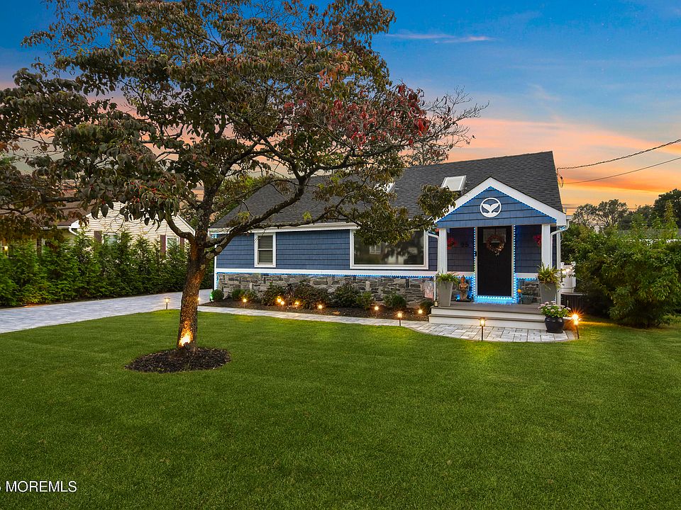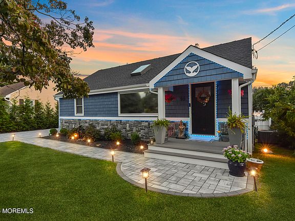 Discover this truly unique custom ranch in Atlantic Highlands- 99% new construction. This home draws you in with a natural stone facade paired beautifully with cedar-style impression siding, while a 2,000 sq. ft. paver driveway sets the tone for impressive curb appeal. Inside, soaring vaulted ceilings with motorized skylights (complete with custom shades) fill the home with natural light. The first level showcases gray-toned hardwood floors, crown molding, and wainscoting. A large picture window anchors the living room (tinted for added privacy). Recessed lighting throughout. The kitchen features sleek quartz counters, a matching backsplash, and GE Café appliances with a double-oven. Movie lovers will appreciate the 85'' retractable projector screens in both the living room and primary Enjoy the spa-like bath with 24"×36" wall tile, plus endless hot water from the tankless hot water heater. The fully finished basement adds valuable living space with a newly added full bath. Have peace of mind with the newer roof, AC, furnace, THWH and washer/dryer. Studio-style detached garage with marble epoxy flooring. Professional landscaping and custom LED exterior lighting complete this remarkable property.