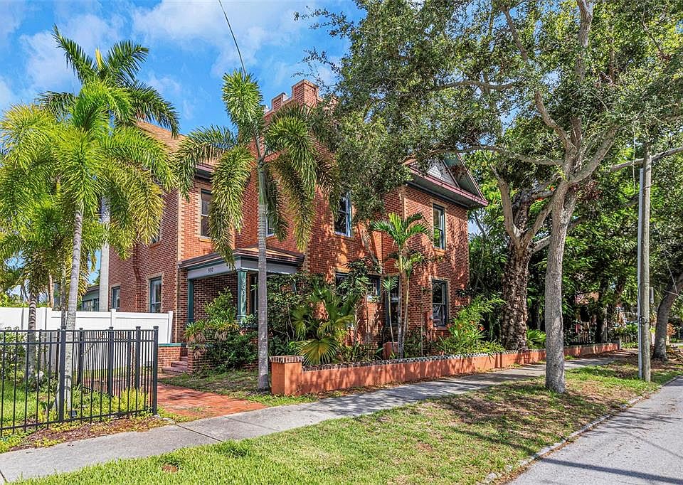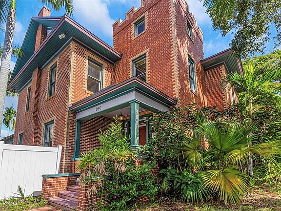 Welcome to the James Henry Residence, a beautifully restored 1905 home that blends historic character with modern comfort. Situated on a double lot in the heart of St. Petersburg, this 3,200-square-foot property features 4 bedrooms plus a loft, 4.5 bathrooms, a pool, wrap-around porch, and a spacious 3-car garage with loft storage—perfect for a future guest suite or ADU. Recognized as a local historic landmark, this home stands out as one of St. Pete’s earliest and most architecturally significant residences. It’s a unique blend of Queen Anne and Tudor Revival styles, with standout features like a castellated tower, asymmetrical gables, stained glass, decorative brickwork, and original wood flooring. Thoughtfully restored, from the studs up, in 2008, it maintains its vintage charm while offering all new plumbing and electric, a fully updated kitchen, modern appliances, stone countertops, dual AC units, and two tankless water heaters. The interior features 10 foot ceilings, newly refinished wood floors, vintage lighting, and other period details, and a freshly painted interior throughout. The layout is ideal for entertaining, with a large living room with a wood burning fireplace that flows into an equally spacious dining room with French doors opening to a covered wrap around porch. Enjoy dining al fresco or host poolside gatherings in the private backyard. There is a bedroom and full bath on the main floor. Upstairs, you will find three generously sized bedrooms, each with their own private bath, a loft perfect for a home office or flex space, and a separate laundry room. The primary suite includes a walk-in closet, garden tub, separate walk-in shower and dual sinks. Additional highlights include a mudroom with custom built-ins, paved patio, fully fenced yard, ample off-street parking, and a newer roof (2021). Ideally located in non-flood, non-evacuation zone, just minutes from downtown, I-275, St. Anthony's Hospital, Crescent Lake, public transit, and more, this home offers both convenience and timeless appeal. Call to see today.