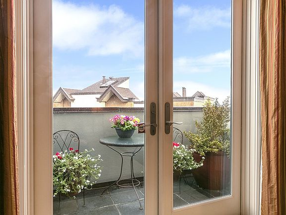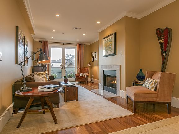 Capacious top-floor house-like 2 level contemporary condo with bay views, elevator, 2 car parking and 3 patios. The main floor features formal living room with fireplace and formal view dining room. The well-equipped open-kitchen with quality appliances and plentiful cabinets & counter space is open to the great room and has patio access. The 4th bedroom (used as office) and full bathroom are also on the main floor. The upper level features a spacious bay view master suite with fireplace, walk-out patio and 2 additional bedrooms and full bath. Beautiful hardwood floors, crown molding and a mix of marble, granite and stone complete the finishes. Plenty of windows & skylights keep it light & bright. Easy n/s commute access. Storage! Turn-key!