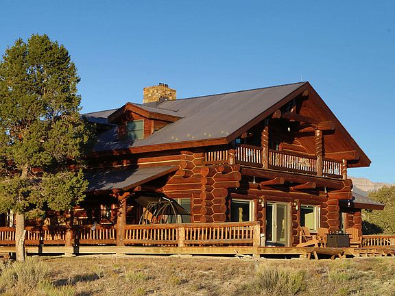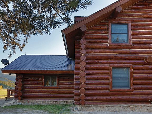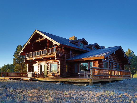 Real log constructionSouthwest style log homeTasteful decorGolden aspen ridgesBlooming chamisaIrrigated meadowsMeandering creek frontage