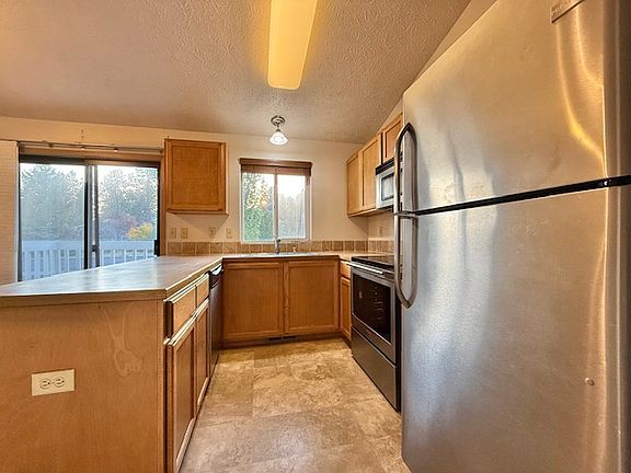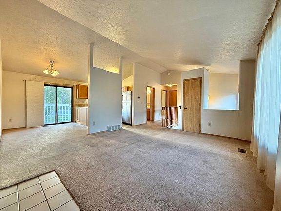 Step inside to a bright, open main level with vaulted ceilings that create a warm, airy feel. The living room, anchored by a cozy gas fireplace, is perfect for relaxing on chilly evenings. The adjoining dining area flows seamlessly to a private back deck, ideal for morning coffee, summer barbecues, or simply unwinding outdoors. The kitchen is a highlight, featuring sleek stainless steel appliances, generous counter space, and a breakfast bar for casual dining.