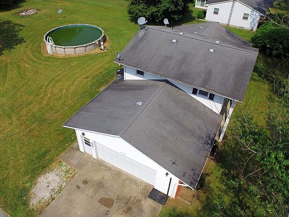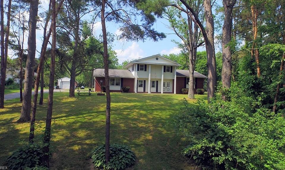 This large 1975 built home sits deep into the property in a rural Warren, Ohio setting. With heavy tree coverage and a long, private driveway, you feel the sense of security and removal from your usual surroundings. Sitting at the top of the property, the home boasts large prominent pillars giving off a strong presence of strength and class. The half brick has many windows and a large set of glass trimmed doors provides the formal entry way. Inside, the split level design maximizes space, placing bedrooms upstairs and leaving plenty of traditional living space on the mid level. The tiled foyer leads to an elevated living room or a mid level carpeted den; both wrapping around to the kitchen. A first floor bath and laundry separate the den side and lead to the garage, while the elevated living room boasts hardwood style flooring and leads to a formal dining area in a well lit room offset from the kitchen. Inside the kitchen you will find dark wooden cabinetry and unique tile countertops. There is a small eating nook under a window. The second floor is accessed from the living room area via staircase, and leads to the three bedrooms and full second floor bath. An inset cove in the wall provides space for decoration here. Each bedroom provides ample space along with closet area. The master houses its own private bath with vanity, commode and shower. Outside a secondary single car garage is found along with an above ground pool.