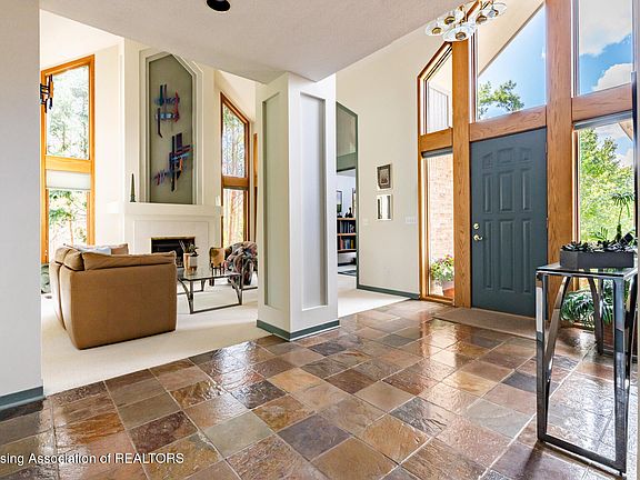Welcome to 950! This spectacular 4,800+ sq.foot 2-story contemporary is offered for the 1st time. Custom built by Dan Zelinski for the current owner, this home is an oasis in the city! No need to travel far, the beautiful in-ground pool, extensive decking and gorgeous landscaping create the perfect stay-cation everyday! The property backs up to a vacant tract of land so maximum privacy. Conveniently located in the back of the Abbott Park Side subdivision within walking distance to Meijer. Minutes to Eastwood Towne Center, East Lansing & MSU. Step up on the covered front porch that faces W. so perfect for a big pot of impatients. The vaulted 2-story foyer sets the tone for this great property. The vaulted 2-story foyer sets the tone for this great property. Dramatic architectural windows on either side of the front door as well as the fireplace (gas) in the formal living room. This room definitely makes a statement! Double glass doors open into a den that overlooks the front yard. Wall of built-in bookshelves. The formal dining room is adjacent to the living room and overlooks the pool and backyard. The island kitchen, breakfast area and family room are definitely the focal point of the house. Sleek white cabinetry, Corian counters, sub-zero refrigerator, double ovens, stainless dishwasher & electric cook-top. Trash compactor and microwave in the island. Breakfast table has a matching Corian top. Sitting area with a full wall of windows overlooking the pool. Slider to the main deck. The family room has a 2nd fireplace, neutral carpeting, wall of built-ins and floor to ceiling windows! Great views for all 4 seasons. Back service hall has a half guest bath, laundry room with newer washer & dryer, loads of cabinets, utility sink & ceramic floor. Side door to the driveway and access to the freshly painted 3+ car garage with tool & lawn cabinets. At the top of the stairs is a loft for study or reading. Nice quiet area. 3 good sized bedrooms. The primary bedroom has unusual vaulted windows with a railing that is open to the family room below. Very dramatic, but private. In-suite bath has a large jet tub, separate shower, double sinks & stool room. Same vaulted windows over the tub. Your very own spa! Large walk-in closet. 2 additional bedroom are a kids delight! Both have ladders to a private loft area with railing for play or sleep. Main bathroom with 1 sink vanity and step-in shower. The "walk-up" lower level is a 2nd home. 41' recreation area with room for a game table, comfy furniture, pool table and the big screen. 3rd fireplace (gas). Mini kitchen with L-shaped bar, refrigerator, sink and cabinetry. 4th bedroom with egress window, 3rd full bath and a study or exercise room. This home really to be seen to be fully appreciated. Come see for yourself you'll fall in love! ***Sept. 2025 ~ 2 new 90+ eff. furnaces & 2 new central air conditioning units installed by Applegate. Transferable warranties.