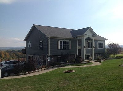 Beautiful custom built home in an area with panoramic views of the country side. It has Green Vinyl siding with custom stone accents. Vaulted ceiling w/open floor plan welcomes this home to family and friends. Kitchen has pro series stainless steel appliances and granite counter tops. Gas Fireplace makes this stunning home extra warm and cozy! Finished basement with warm colors and French doors to a beautiful deck patio and new custom built fire pit patio. Turn key home w/finished landscaping 2 car attached garage and a black top driveway. Only minutes to town and shopping!! If you are looking for the ultimate family home, this is it!!!