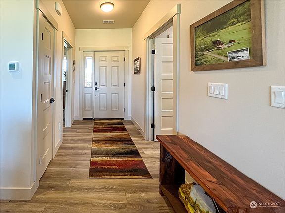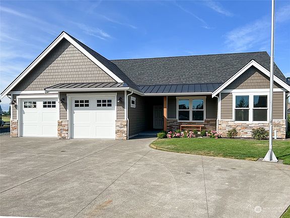 Beautiful custom home in Bogaard Meadows! Immaculately kept, open design floor plan w/many upgraded finishes. Zero threshold as you enter home w/covered front porch, vaulted ceiling in living room w/stacked stone gas fireplace & built ins, dining open to gourmet kitchen w/custom cabinets, polished quartz counters throughout, center island w/eating bar, walk in pantry, mud room, private primary suite w/walk in glass tile shower, double vanity & walk in closet. Private shop room w/separate entrance, pull down ladder to attic storage, back covered patio, great afternoon sun w/Canadian mountain views, raised garden beds, sprinkler system & darling shed! Perfectly located on cul-de-sac, close to shopping, banking, restaurants, bus line & more!