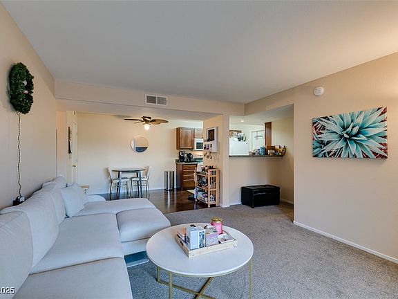 First floor condo in desirable gated community. Custom paint and upgraded flooring throughout. Newer carpeting in living room and bedrooms. Functional kitchen with breakfast bar is complete with granite counters and newer dishwasher and stove. Full size washer and dryer plus extra storage in laundry. Primary bedroom has walk-in closet with shelving and full bath with large garden tub & shower combination. Secondary bedroom is at opposite end of unit. Living room features a sliding door leading to the covered patio. Assigned carport parking in front of unit in addition to ample guest parking. Horizons @ Seven Hills features resort-style amenities including two pools, spa, fitness center, clubhouse, BBQ areas and scenic walking paths. It is conveniently located near parks, shopping, dining, post office, hospital, and top-rated schools.