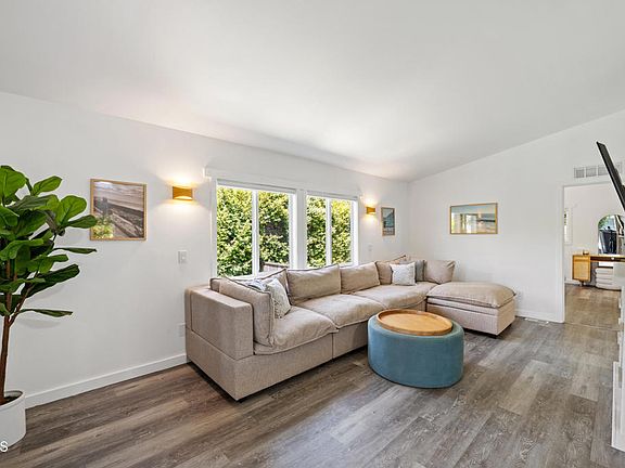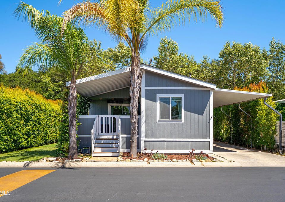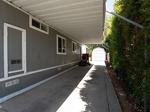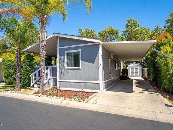 PRICE IMPROVEMENT! Welcome to Ojai Oaks, an all-age community offering wonderful amenities including a sparkling pool, clubhouse and game room. This beautifully maintained 2-bedroom, 2-bathroom manufactured home has been thoughtfully updated throughout.Inside, you'll find a modernized kitchen with butcher block counters, newer appliances, and wood-like flooring. The open layout is bright and inviting filled with natural sunlight. Dual-paned windows and central A/C keep this home cool in the summertime, for year-round comfort! Enjoy a spacious backyard, boasting a covered back patio complete with slate floors, pull down shades, ceiling fans, low-maintenance synthetic grass, and mature landscaping creating a true retreat! The property also includes a long carport, large lofted shed for storage and a fenced pet area. The front porch is currently used as a home gym, but could easily be reimagined as another outdoor living space to lounge, enjoy a cup of coffee in the morning or enclosed and made into a third bedroom. Located less than 4 miles to downtown Ojai and just 12 miles to Ventura Pier and downtown Ventura. Don't miss the chance to live in this welcoming community with fantastic amenities--schedule a showing today!