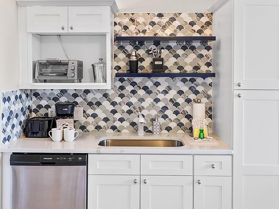 Renovated studioElegant fish-scale tile designMidsize refrigeratorNew kitchenetteStylish fish-scale tile backsplashFloating shelvesNew sink