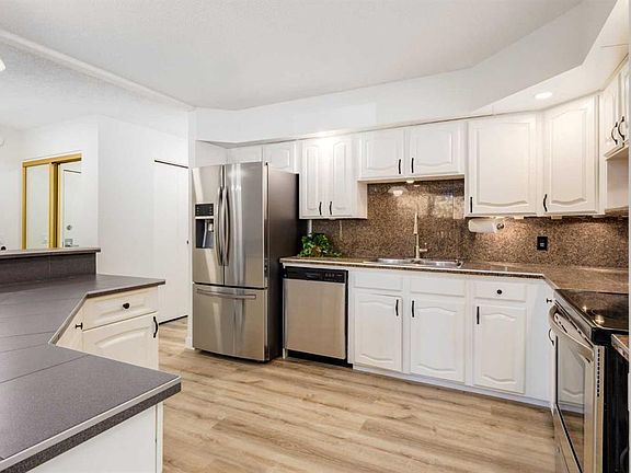 Right sizing made easy! This large pristine corner, end unit with 2 bedrooms, 2 bathrooms, 2 storage lockers, & 2 dedicated parking spaces is a GEM! Heritage Manor is a 55+ concrete building with secure underground parking, designed for active adults. Enjoy the indoor pool, hot tub, sauna, fitness room or book the party room! What makes it even better is this bright turnkey home has new paint, new vinyl plank flooring, new carpet, new trim, and a fresh feel! It is flooded with an abundance of sunlight. The private fenced patio area with direct street access creates a sense of living in a sprawling detached bungalow. Every room is generously sized. The kitchen offers extensive counter space, a center island with an eat-up bar, pantry, stainless steel appliances, and white cabinetry with black hardware. The living room has three large windows, a fireplace, and ample space for entertaining family and friends. The dinning area has room for a large table + sideboard or hutch. There is in suite laundry, a plethora of storage, and a 4pc main bathroom. The spacious primary suite boasts 3 full closets plus a 5 pc ensuite with dual sinks. The versatile 2nd bedroom makes for a perfect guest room, office, or hobby room. A new reserve study completed in January 2025 further enhances confidence in your investment. Just steps away are local shops like “The Apple Lady” & “The Social Grind” coffee shop. Oak Bay Plaza, Oakridge Mall & Glenmore Landing are mere moments away. Neighboring South Glenmore Park & the Oakridge Community Association make staying active a breeze. If you are ready for the convenience of a maintenance free, lock & leave lifestyle without compromise, look no further! Welcome Home.