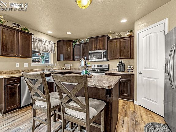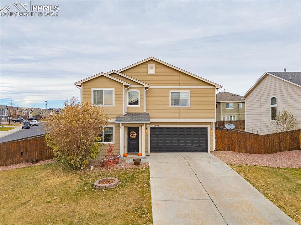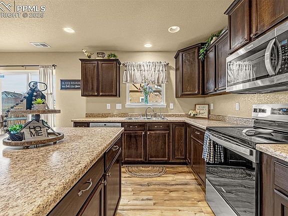 Welcome to this spacious two-story home in Cuchares Ranch, ideally located near Peterson AFB, Fort Carson, and the Colorado Springs Airport. Parks, trails, and open space are just moments away, offering the perfect blend of convenience and outdoor living. Sitting on a generous corner lot, the home features a standout backyard with a large concrete patio, a pergola for shaded relaxation, and a built-in fire pit—perfect for entertaining or enjoying peaceful Colorado evenings. Inside, the main level welcomes you with a versatile front sitting room that can double as a bright home office. A powder room and dedicated storage room add to the home’s practicality. The open great room seamlessly connects the living area, dining space, and kitchen. The kitchen features stainless steel appliances, a spacious corner pantry, an island with seating, and a convenient countertop area perfect for a coffee bar or additional prep space. Upstairs, a generous loft provides an additional living or flex area. The primary bedroom is impressively large, filled with natural light from a big picture window. Its private en-suite offers a true retreat with a deep soaking tub, a freestanding shower, a double vanity, and a separate water closet, all complemented by a large walk-in closet. Two additional bedrooms each include their own walk-in closets, providing comfort and ample storage. This level also includes the laundry room and the home’s third bathroom for everyday convenience. Additional highlights include air conditioning, a water softener, and brand-new carpet, making this home truly move-in ready. This Cuchares Ranch gem offers comfort, space, and an exceptional location.