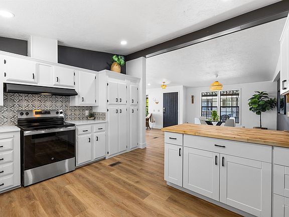 Spacious and stylish, this 3 bedroom, 2 bath home is located in a wonderful 55+ community. Enjoy the warmth of the electric fireplace and the abundance of natural light that fills the living spaces. The kitchen showcases a striking blend of butcher block and quartz countertops, complemented by designer finishes throughout. Both bathrooms have been thoughtfully updated, including a beautiful freestanding soaking tub in the primary suite. The home also features new flooring and fresh paint throughout. Beautiful stonework enhances the front exterior, and the landscaped yard is equipped with a updated sprinkler and drip systems. A covered patio offers the perfect spot to relax or entertain, while a storage shed and fenced-in yard add convenience and functionality.