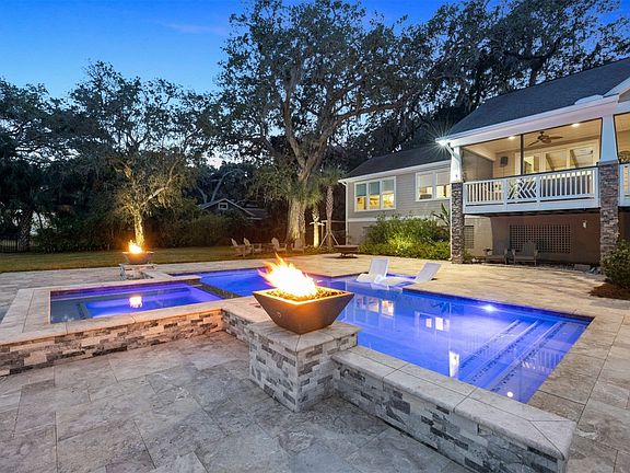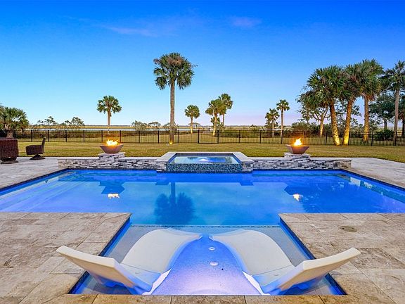 Calling all boating enthusiasts! Custom-built pool home with 150 ft. of deep water frontage. Long easterly views and coastal breezes overlooking Alligator Creek, Nassau River, and marshlands stretching to Amelia Island. Gated and fully fenced property is over an acre with sweeping live oaks, palms, citrus trees, and lush landscaping. Designed by renowned architect Michael Stauffer, the home features an open kitchen and vaulted great room, American cherry floors, 4 bedroom split floor plan with spacious primary suite with fireplace, walk-in closets. On the opposite side of the home are two bedrooms with Jack & Jill bath. Enjoy the elevated screened porch, expansive heated pool and spa (added 2024), and a huge garage with storage for all your water toys. Covered boathouse with new roof and floating dock. Whole house generator. Extensive landscape lighting throughout the property. Stunning at night!! Exterior painted this year.