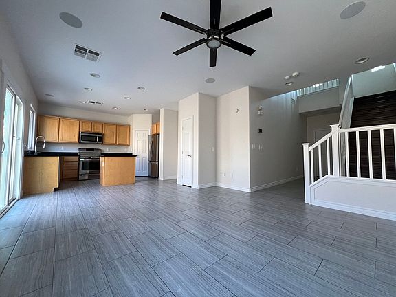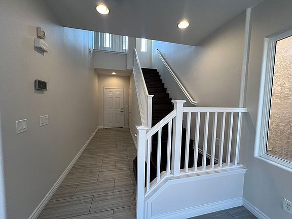 Move in ready! 3 bedrooms and 2.5 bathrooms. Situated at the end of the Mountains Edge community, this two-story home is move-in ready with fresh paint inside and out, full appliances, pristine tile, and stylish laminate wood flooring throughout. The kitchen boasts a spacious walk-in pantry, an island, and ample counter and cabinet space for all your culinary needs. Upstairs, the primary bedroom features an ensuite bathroom with double sinks, a roman tub/shower combo, and a huge walk-in closet. For added convenience, a full-size washer and dryer are located upstairs.