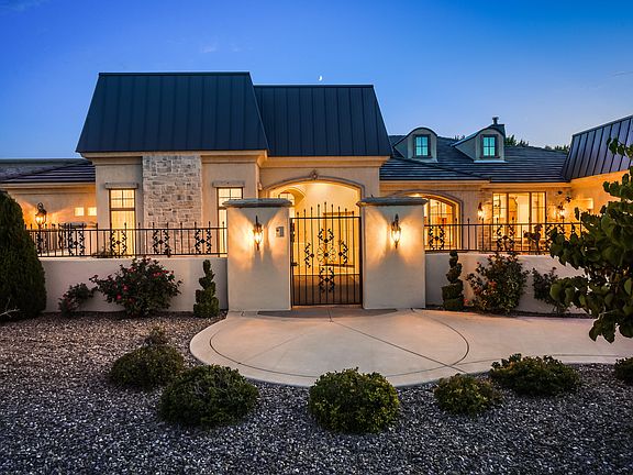 This elegant estate was inspired by classical French architecture. Manicured formal gardens with trickling fountains, and cantera stone accents create an atmosphere unlike any others in Albuquerque. The interior of the home features classical detailing such as backlit coved ceilings, traditional millwork, 4 cast concrete fireplaces, beautiful wood doors, tall windows, and intimately scaled spaces. High end features include exotic imported marble, Plyrich and Waterworks plumbing fixtures, Schonbek crystal chandeliers, backlit onyx countertops, and handcrafted furniture grade cabinetry. The home features 3 bedroom suites, a home gym which could be converted into a 4th bedroom, a home office, and formal and informal living and dining areas. Truly One of a kind!