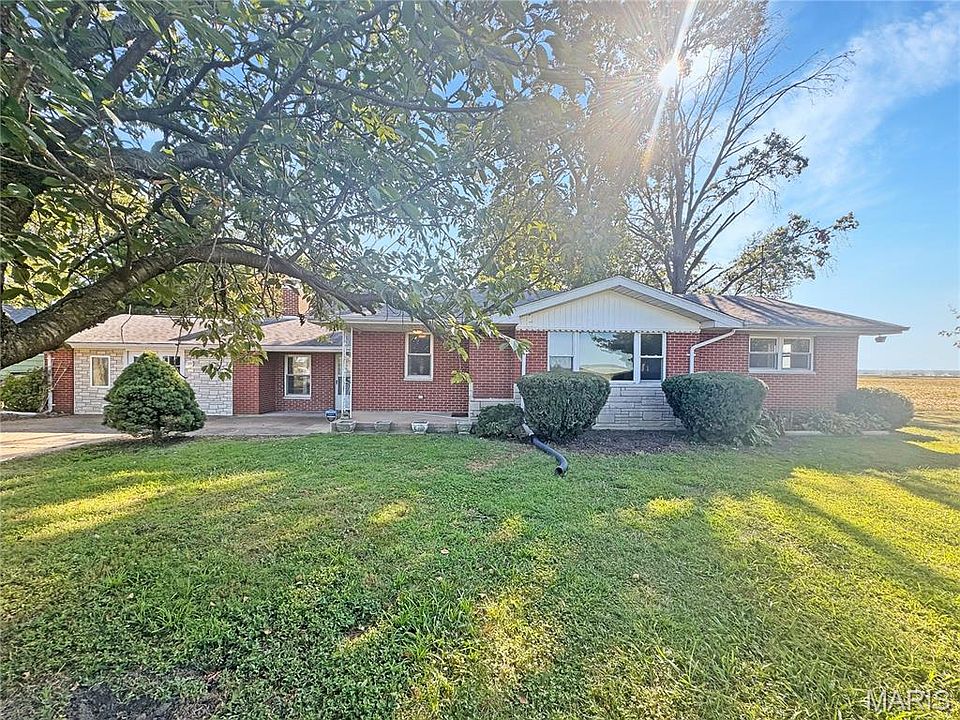 Fall in love with the serene park like setting with mature trees including some fruit trees & amazing view of the bluffs! This Recently updated 3 bedroom brick ranch home with 0.85 acres is waiting for you to call Home! Enter to find gleaming refinished hardwood floors in the living room that opens to the eat in kitchen with new appliances, loads of cabinets, new lighting & flooring. Off the kitchen, you will find the hearth room with a beautiful wood burning fireplace attached to the cavernous family room with french doors leading to the outside. 3 generous sized bedrooms (2 with bamboo floors), updated full bath & laundry closet complete the main level. Other updates include a NEW hot water heater, newer roof 2018, furnace 2016, newer A/C and thermostat 2019, newer toiler, and guttering along back of house 2022. Currently on public water & well available if desired. Plenty of storage space in the full unfinished basement or the large shed with electric & concrete floor. Home is located in a flood plain, insurance will be $300-400 per month. be sure to speak to your lender before making an offer.