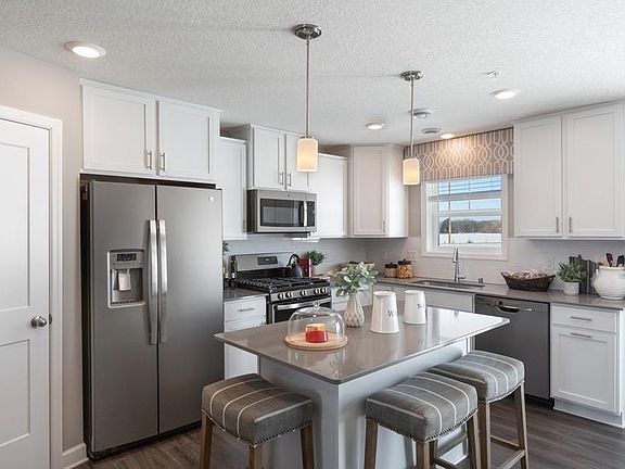 Lennar's "Colonial Patriot" Collection-Madison Floorplan. Open & light-filled, two-story rowhome-style, with large windows front & back. Open main level floorplan with electric corner fireplace and walk-out to a patio & backyard. Designer kitchen with white cabinetry, quartz countertops, slate-finish appliances, gas stove, center island, backsplash & pantry closet. Upper level features three bedrooms, cozy loft, two bathrooms & laundry room. Spacious owner's suite with large walk-in closet. Private owner's bath with 5-ft. walk-in shower & double-sink vanity. Built to be move-in-ready, complete with washer/dryer & window blinds. Plus Lennar's "Connected Home" features. Two-car garage. New Construction & Manufacturer Warranties. Located in the popular Laketown neighborhood with trails & parks, close to quaint downtown Victoria and Chaska shopping.