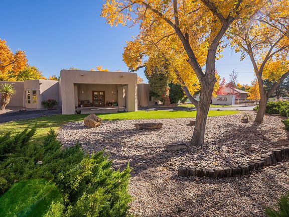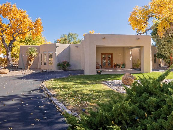 Welcome to this warm and inviting residence located in the highly sought-after Riverfront Estates. Set among mature trees and vibrant seasonal foliage, this home offers a serene, park-like setting with the perfect blend of Southwest charm and timeless comfort. Step inside to a spacious, light-filled interior highlighted by vaulted ceilings with exposed beams, custom tile flooring, and expansive living spaces ideal for both entertaining and everyday living. The welcoming great room features a Kiva fireplace, abundant natural light, and a beautiful custom entertainment area that serves as the heart of the home. The Four well appointed bedrooms including an amazing primary suite with a large sitting room or office, and a spa like primary bathroom all on an acre in the heart of the Bosque!