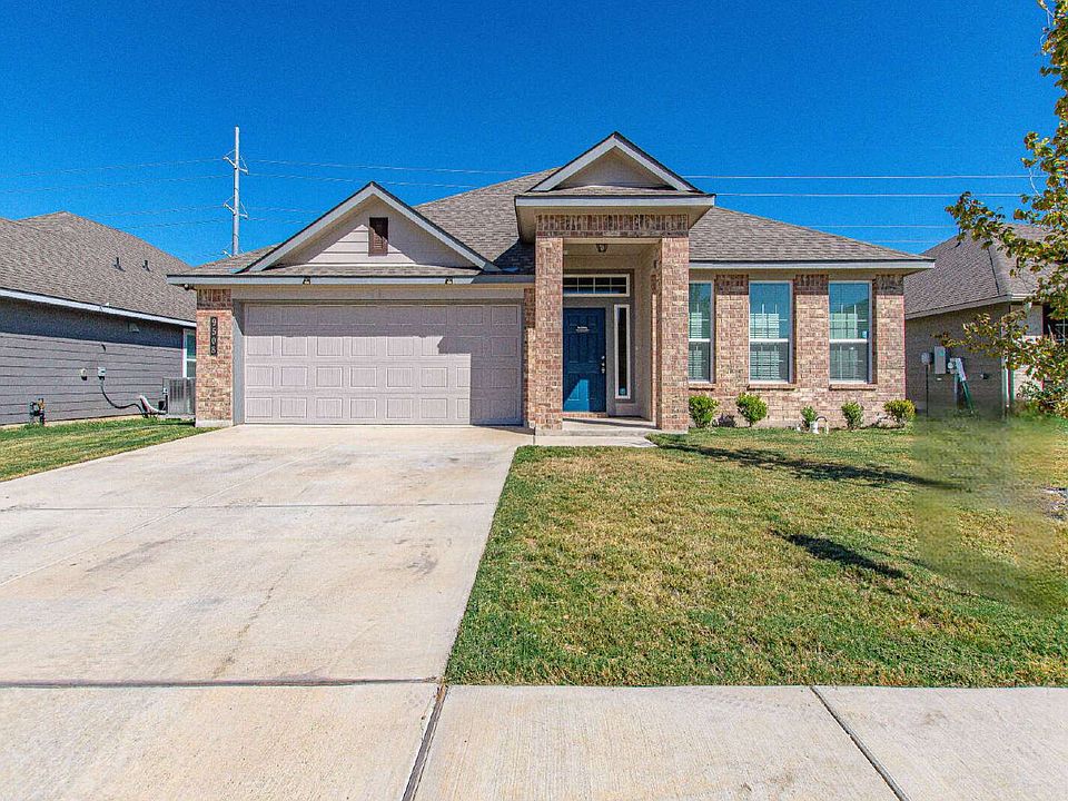 This home boasts an open floor plan in the living room, creating a spacious and inviting atmosphere. The kitchen is designed with custom cabinets, a center island, granite countertops, a pantry, and stainless steel appliances. Rooms are comfortably sized and include storage closets. A laundry room with washer/dryer hookups adds convenience, while the primary bedroom offers a walk-in closet and a bathroom with a shower-only layout and vanity. The backyard is privately fenced, and an attached garage at the front provides additional practicality.