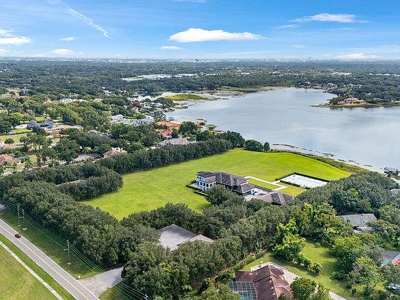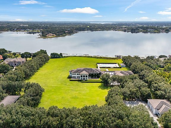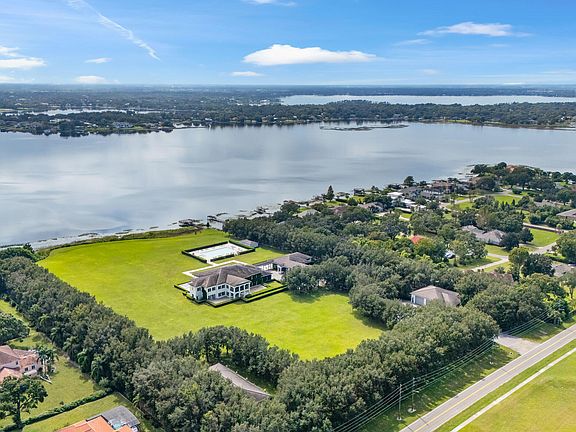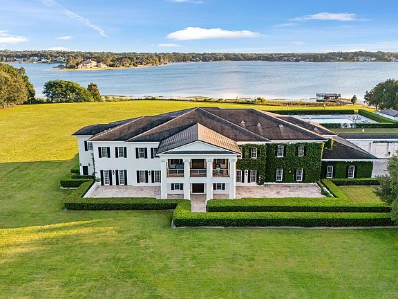 Discover this Perfectly positioned Georgian Estate situated on 12 acres (additional 6 acres available) of lakefront property with meticulously manicured grounds. This walled and gated compound includes approx 614 feet of pristine lake frontage and panoramic views on Lake Down of the Butler Chain of Lakes. The magnificent sprawling primary residence pairs classic Georgian architecture with modern amenities to achieve the ultimate lakeside retreat. Immediately you are greeted by the finest materials and finishes inside an elegant entryway which opens into a grand interior boasting a floating mahogany staircase, marble floors and paneled walls all framed by stunning Murano chandeliers. An art gallery leads into a spacious living room lined with mahogany walls and boasts expansive waterfront vistas. The gourmet kitchen is a chefs delight featuring a salamander for warming and broiling, two double convection ovens, a large commercial icemaker and a commercial refrigerator and freezer. Downstairs also includes one of two owner's suites along with a spacious library-lounge or possible 6th bedroom suite. Dual staircases or a commercial Thyssenkrupp elevator offer access to the second level featuring four more expansive bedroom suites, including the main owner's retreat, and an 85-foot parlor highlighted by 20-foot ceilings, bookshelves and a wet bar the perfect venue for hosting family and friends. A screened porch captures spectacular southern lakefront views and nightly fireworks displays from Walt Disney World. Connected by a breezeway, a grand rustic lodge comprised of 5,600 square feet and equipped with a large bar, catering kitchen, entertainment hall and locker facilities offer limitless potential. The outdoors is the ultimate playground complete with a Junior Olympic pool and spa while a fountain and light features await. Additional amenities include a 3,800-square-foot storage building with 20-foot ceilings, staff quarters with 576 square feet of living space, a patio area and courtyard and a 4,000-square-foot paneled garage with separate office, guest apartment and 20-foot ceilings for the auto aficionados treasured collection with 3 separate garages including room for a full-size motor coach and car collection. Situated in one of Central Floridas most sought-after locations, this truly exceptional estate epitomizes luxury, privacy and sophistication to offer an enviable lakefront lifestyle.