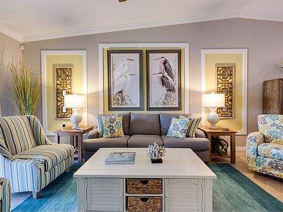 The “Arabella” floor plan features two bedrooms, two bathrooms, a spacious den, two screened-in lanais, and a one-car detached garage. It boast many upgraded features custom designer finishes including accent walls, lighting, wainscoting, plantation shutters and crown molding.